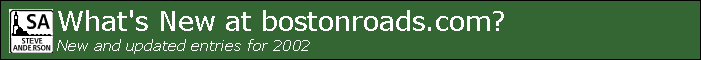 FEBRUARY 10-16, 2002: Corrections and updates made to the Northern Expressway (I-93), Northwest Expressway (US 3), Pilgrims Highway (MA 3), Southeast Expressway (I-93, US 1 and MA 3) and Yankee Division Highway (MA 128, I-95, I-93 and US 1) pages.