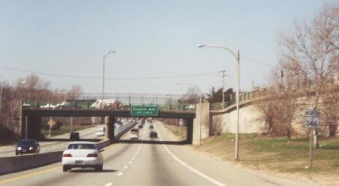 This 2001 photo shows the northbound RI 146 Expressway approaching EXIT 1 (Branch Avenue) in Providence. Exit numbers on RI 146 were not added until 2019. (Photo by Steve Anderson.)